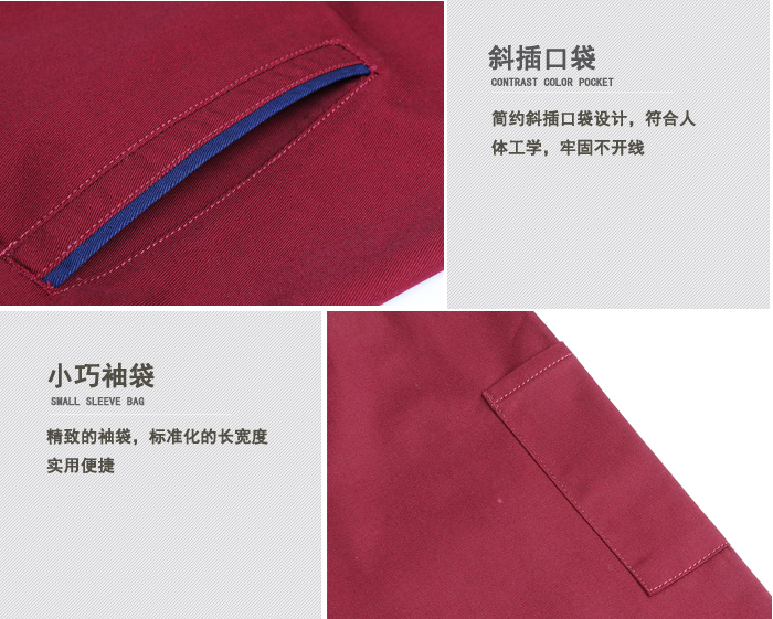 也有的企業會在左衣袖上加一個臂袋,衣袖上的臂袋是考慮在工作時做一些記錄時要用的筆拿取方便,另外還可以根據工作需要多做或少做一些口袋,這主要根據各企業的工作環境和要求制作。