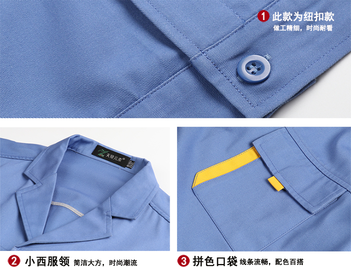 3、細節 工作服根據企業要求和工作崗位不同是不盡相同,比如機械工人的工作服要求是緊身的,下擺、袖口、褲腿都是可以扣起來的。化工行業的化驗人員穿著的工作服應是較為厚實的緊袖。外賣、快遞員的工作服需要多口袋設計,便于攜帶物品。穿合適的工作服,更加有利于便捷工作。