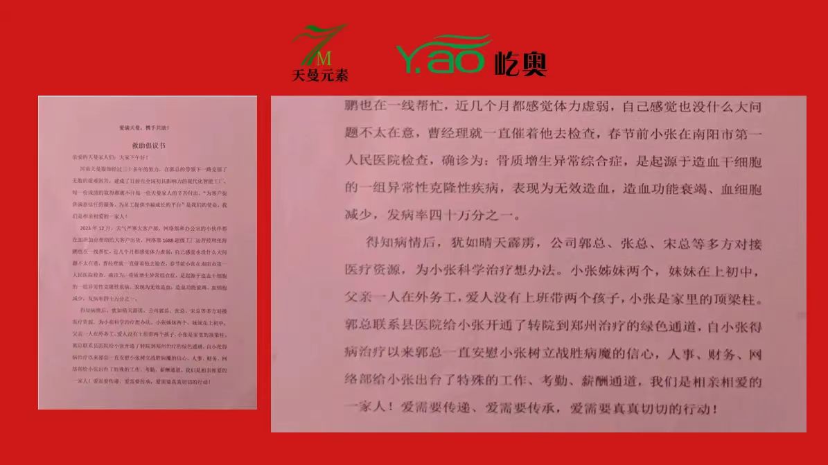 得知病情后,猶如晴天霹靂,公司郭總、張總、宋總等多方對接醫療資源,為小張科學治療想辦法。郭總聯系縣醫院給小張開通了轉院到鄭州治療的綠色通道,自小張得病治療以來郭總一直安慰小張樹立戰勝病魔的信心,人事、財務、網絡部給小張出臺了特殊的工作、考勤、薪酬通道,我們是相親相愛的一家人!愛需要傳遞、愛需要傳承,愛需要真真切切的行動!