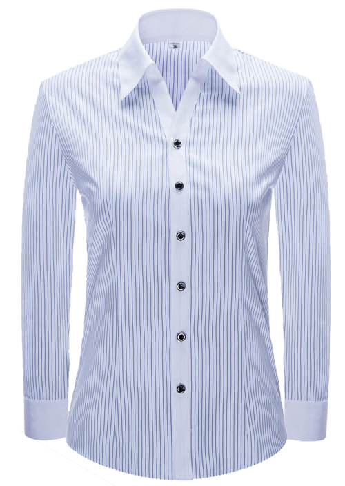 • 產品簡介:品名:女長袖v領襯衣;版型:修身版;貨號:YW3006 ;面料:Y3006;顏色:藍色寬細堅條 ;Fabric:C30/T48/TS22